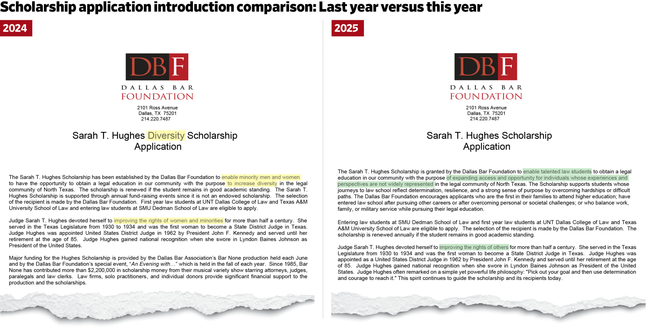 When it was called the Sarah T. Hughes Diversity Scholarship, the description said it was established to enable “minority men and women to have the opportunity to obtain a legal education in our community with the purpose to increase diversity in the legal community of North Texas.” It went on to say Judge Hughes “devoted herself to improving the rights of women and minorities for more than half a century.”