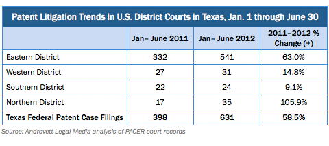 The number of new patent cases filed in the Northern District of Texas during the first half of 2012 more than doubled the number filed during the first six months of 2011. The Eastern District saw its new patent filings jump 63 percent. The Western and Southern districts witnessed significant increases, too.