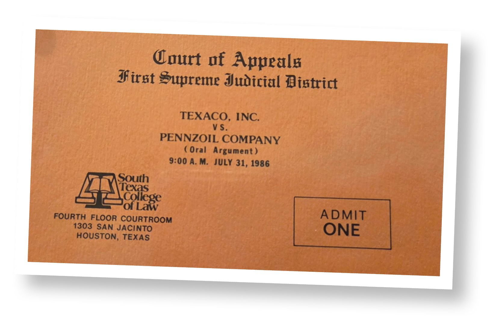 Between Thanksgiving 1985 and Christmas 1987, the two energy companies and their ever-expanding roster of litigators did battle. The litigation itself multiplied, including a precedent-setting federal case in New York over Texaco’s appeals bond, a monumental appellate battle, a bizarre decision by the Texas Supreme Court, the world’s largest corporate bankruptcy at the time and a historic settlement.