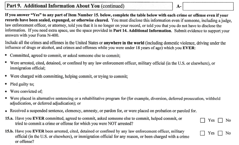 Moreover, all applicants for naturalization must complete U.S. Citizenship & Immigration Service Form N-400. On it they must declare whether they have ever “committed, agreed to commit, … helped commit, or tried to commit” any crime “anywhere in the world,” even if they were never charged or arrested.