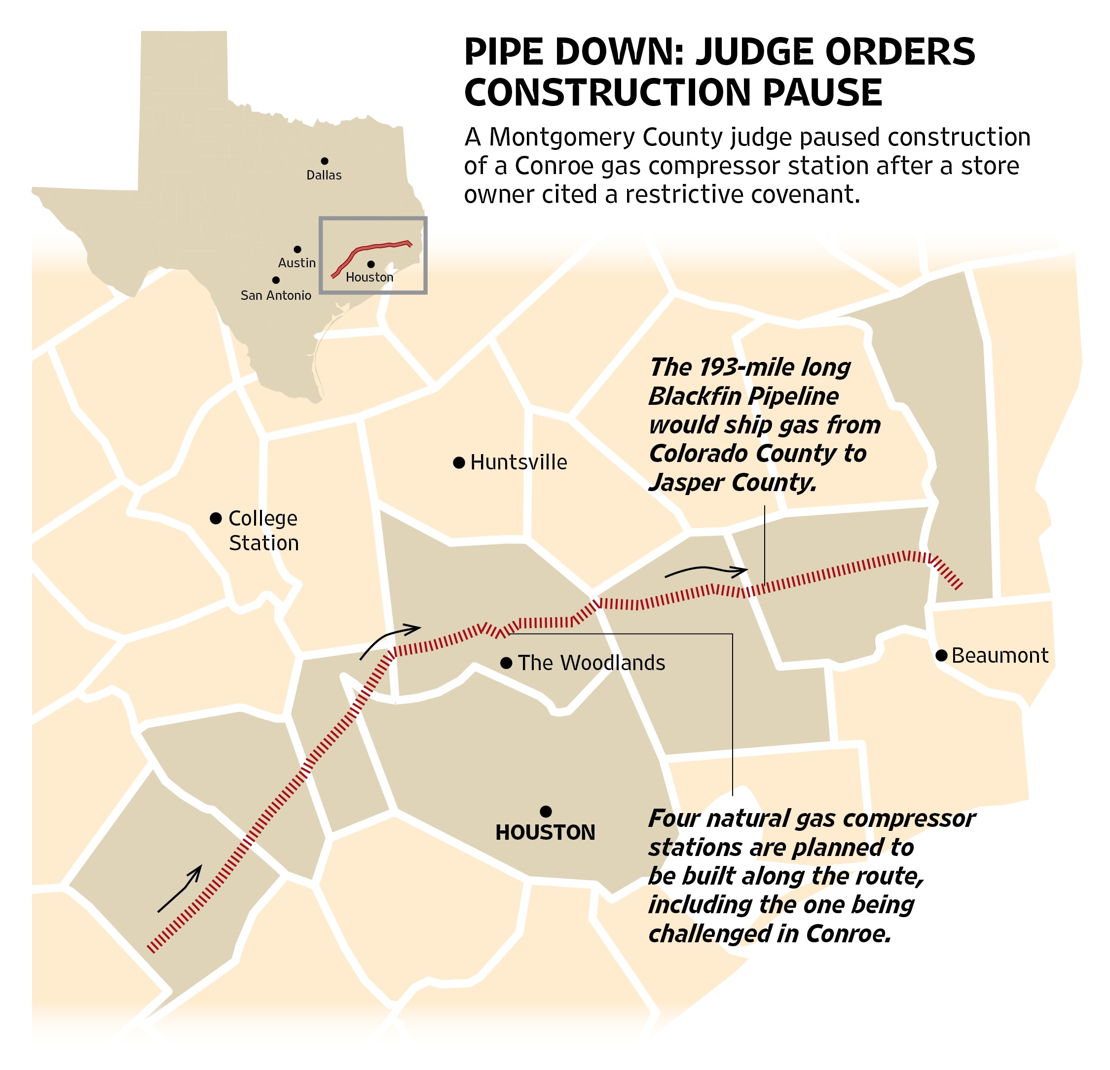The owners of a luxury home furnishings store in Conroe have been granted a temporary injunction that, for now, puts a stop to construction of a natural gas pipeline and compressor station next door.