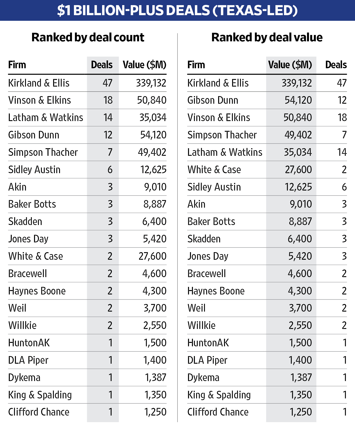 The Texas lawyers at four law firms — Kirkland & Ellis, Vinson & Elkins, Latham & Watkins and Gibson, Dunn & Crutcher — were the lead legal advisors in the majority of mergers, acquisitions, joint ventures and divestitures valued at $1 billion or more last year.
