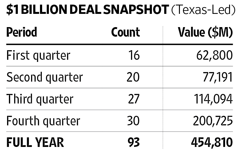 The 93 Texas-led billion-dollar deals had a combined value of $454.8 billion, according to the CDT database.
