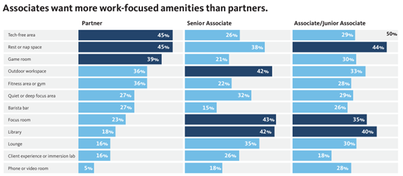 Designing workplaces for a mix of uses also helps accommodate the desires of employees at all levels. Respondents at the partner-level want tech-free areas and game rooms, while associates of all ranks seek focus rooms and libraries. Across the board, respondents highly value access to rest and nap spaces.