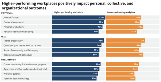 Overall, respondents in higher-performing workplaces report that their firms create a climate that continuously fosters innovation (95 percent), compared to lower-performing workplace respondents (62 percent). Higher-performing workplace respondents also indicated that the overall design of their workplace helps attract and retain talent (88 percent) compared to lower-performing workplace respondents (64 percent). With 100 percent of high-performing respondents indicating they have job satisfaction, it’s evident that positive space efficiency and experience correlate to a firm’s ability to attract and retain talent.