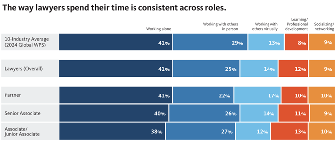 Partner-level survey respondents indicated they spend about one-third of their time in the office, and while they’re in the office, they seek leadership visibility and connection. Conversely, younger associates spend roughly two-thirds of their time in the office for access to technology and focusing on work.