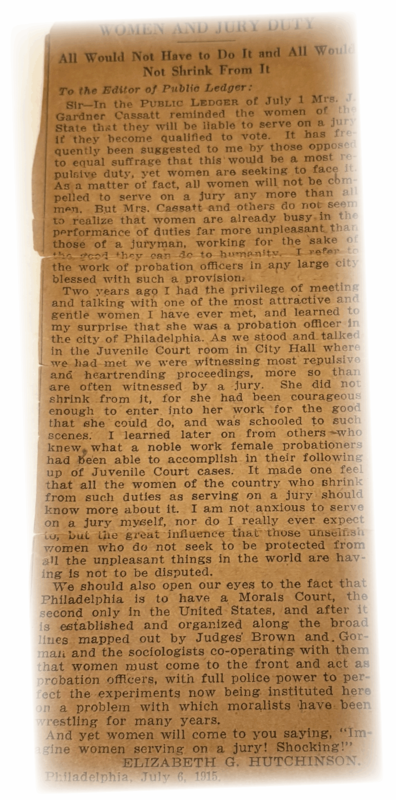 In a Letter to the Editor dated July 6, 1915, Nana, a/k/a Elizabeth G. Hutchinson, responded to a letter from “Mrs. J. Gardner Cassatt.” Mrs. Cassatt had warned that, if permitted to vote, women would be subject to jury duty, an unpleasant role unfit for women; per Cassatt and other anti-suffragists, it would not be appropriate for women to serve on juries, and, in order to avoid such an untenable situation, women would have to be denied the right to vote.