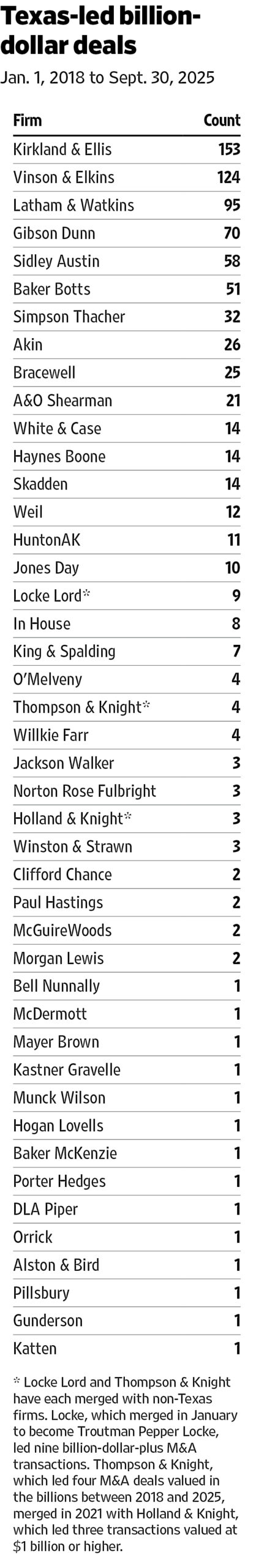 Sixteen law firms in Texas have led or co-led 10 or more deals valued in the billions. Texas lawyers for six law firms — including Baker Botts, Sidley Austin, Gibson Dunn and Latham & Watkins — led 50 or more such M&A transactions during the past seven years and nine months.