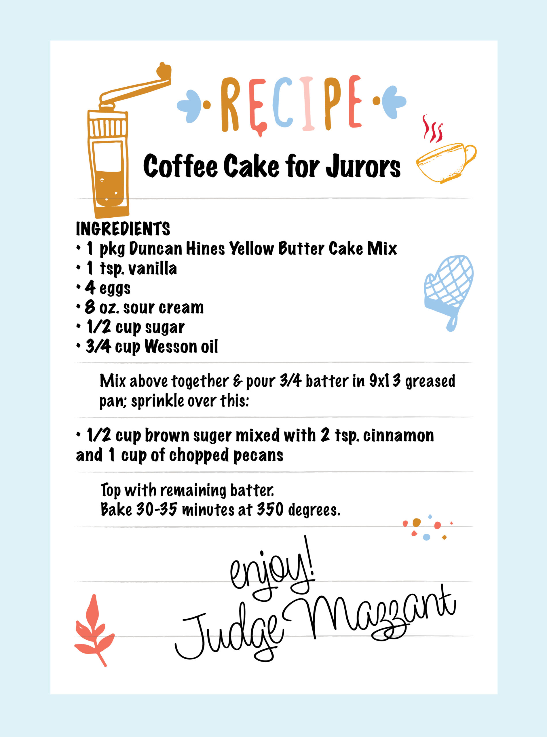 Judge Mazzant, chief judge of the Eastern District of Texas, has a longstanding practice of surprising jurors seated for trial in his Sherman courtroom with an unexpected treat: a home-baked coffee cake, from the oven of the judge himself.